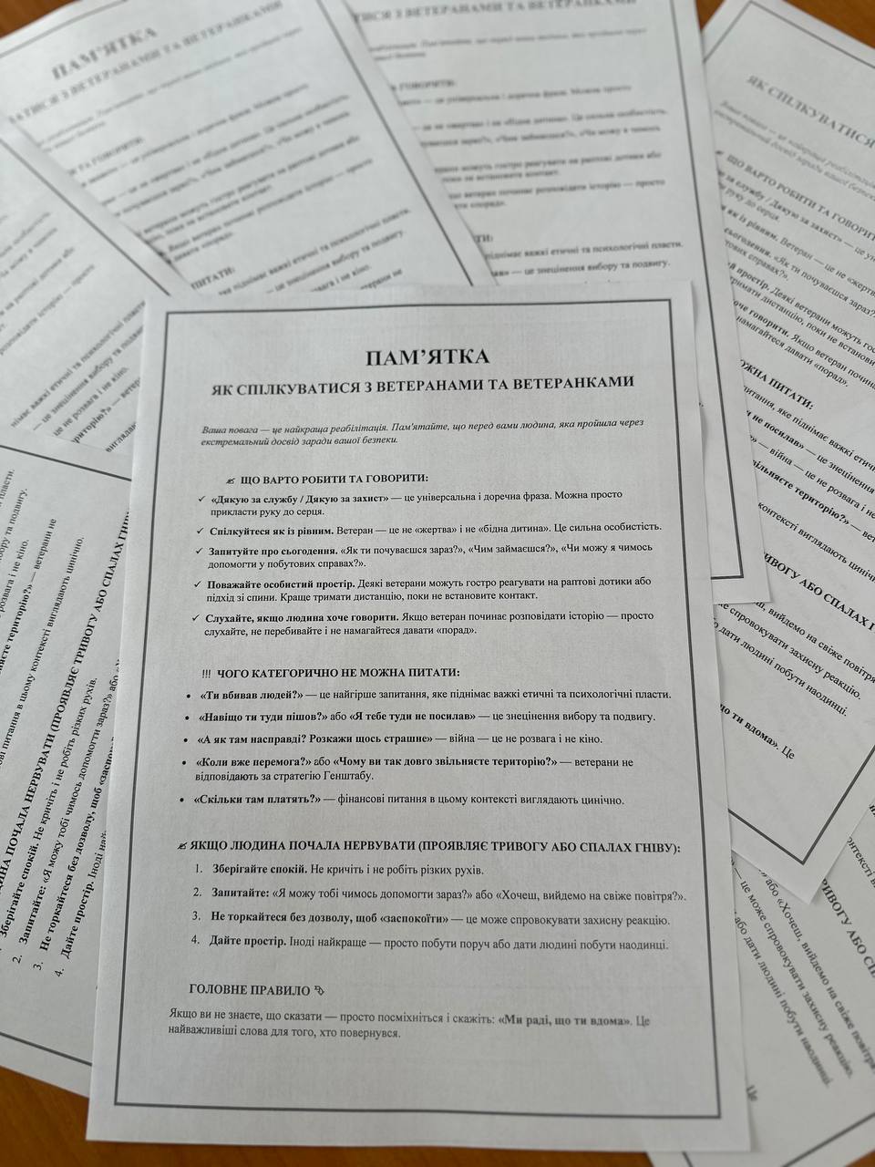До наради Поліна ДЕНИСОВА підготувала Пам’ятку, як спілкуватися з ветеранами та ветеранками, яку роздала всім працівникам Фітолабораторії. В ній сформовані чіткі правила, в яких зазначено, що варто говорити, спілкуючись з ветеранами, і чого категорично не можна питати. Також описано алгоритм дій, якщо під час спілкування ветеран або ветеранка почали нервувати чи проявляти тривогу.