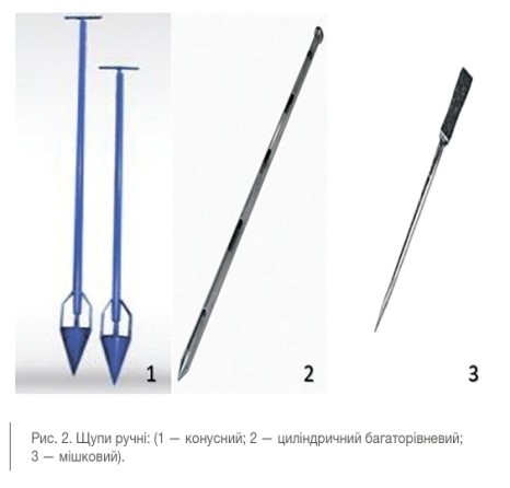 - конусний щуп застосовують для відбирання проб із насипу, транспортних засобів, незашитих мішків тощо.